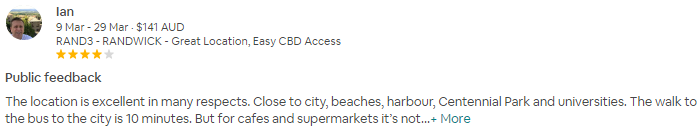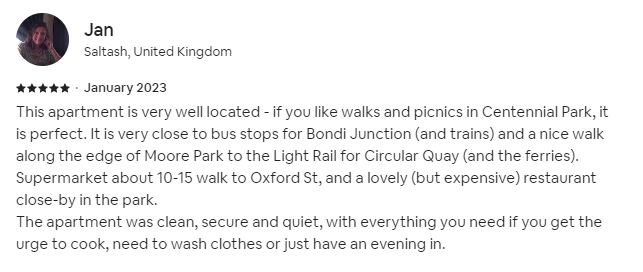 The location is excellent in many respects. Close to city, beaches, harbour, Centennial Park and universities. The walk to the bus to the city is 10 minutes. But for cafes and supermarkets it’s not well located. A car is needed. No cafes or supermarkets close by. Shaz provided quick responsive service which was excellent.