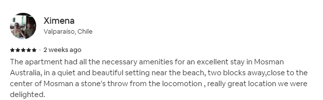 The apartment had all the necessary amenities for an excellent stay in Mosman Australia, in a quiet and beautiful setting near the beach, two blocks away,close to the center of Mosman a stone's throw from the locomotion , really great location we were delighted.