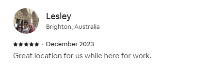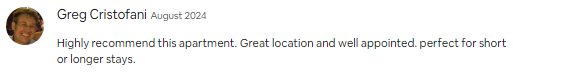 Highly recommend this apartment. Great location and well appointed. perfect for short or longer stays.