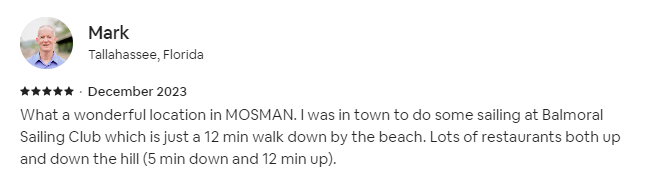 What a wonderful location in MOSMAN. I was in town to do some sailing at Balmoral Sailing Club which is just a 12 min walk down by the beach. Lots of restaurants both up and down the hill (5 min down and 12 min up).
