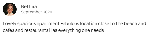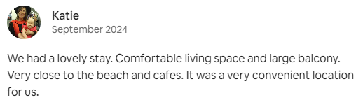 We had a lovely stay. Comfortable living space and large balcony. Very close to the beach and cafes. It was a very convenient location for us.