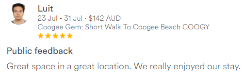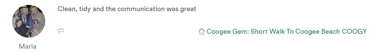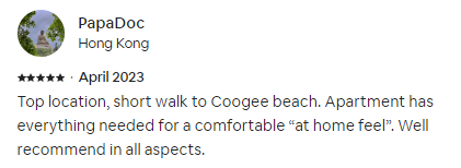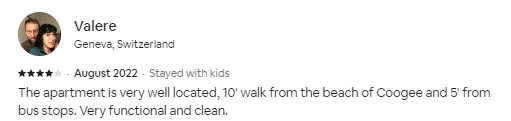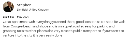 Top location, short walk to Coogee beach. Apartment has everything needed for a comfortable “at home feel”. Well recommend in all aspects.