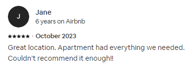Great location. Apartment had everything we needed. Couldn’t recommend it enough!!