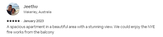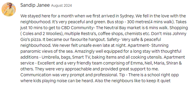 We stayed here for a month when we first arrived in Sydney. We fell in the love with the neighbourhood. It’s very peaceful and green. Bus stop - 300 metres(4 mins walk). Takes just 10 mins to get to CBD Community- The Neutral Bay market is 6 mins walk. Shopping ( Coles and 2 Woolies), multiple Restra’s, coffee shops, chemists etc. Don’t miss Johnny Gio’s pizza. It became our favourite hangout. Safety- Very safe & peaceful neighbourhood. We never felt unsafe even late at night. Apartment- Stunning panaromic views of the sea. Amazingly well equipped for a long stay with thoughtful additions - Umbrella, bags, Smart TV, baking items and all cooking utensils. Apartment service - Excellent and a very friendly team comprising of Emma, Neil, Maria, Shiran & others. They were very approachable and provided great support to me. Communication was very prompt and professional. Tip - There is a school right opp where kids playing noise can be heard. Also the neighbours like to keep it quiet