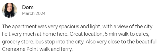 The apartment was very spacious and light, with a view of the city. Felt very much at home here. Great location, 5 min walk to cafes, grocery store, bus stop into the city. Also very close to the beautiful Cremorne Point walk and ferry.
