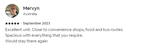 Excellent unit. Close to convenience shops, food and bus routes.