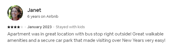 Apartment was in great location with bus stop right outside! Great walkable amenities and a secure car park that made visiting over New Years very easy!