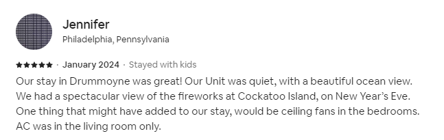 Our stay in Drummoyne was great! Our Unit was quiet, with a beautiful ocean view. We had a spectacular view of the fireworks at Cockatoo Island, on New Year’s Eve.