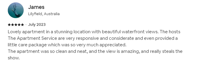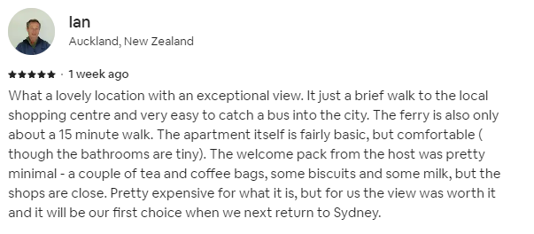 What a lovely location with an exceptional view. It just a brief walk to the local shopping centre and very easy to catch a bus into the city. The ferry is also only about a 15 minute walk. The apartment itself is fairly basic, but comfortable ( though the bathrooms are tiny). The welcome pack from the host was pretty minimal - a couple of tea and coffee bags, some biscuits and some milk, but the shops are close. Pretty expensive for what it is, but for us the view was worth it and it will be our first choice when we next return to Sydney.