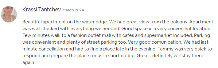 Beautiful apartment on the water edge. We had great view from the balcony. Apartment was well stocked with everything we needed. Good space in a very convenient location. Few minutes walk to a fashion outlet mall with cafes and supermarket included. Parking was convenient and plenty of street parking too. Very good comunication. We had last minute cancellation and had to find a place late in the evening. Tammy was very quick to respond and prepare the place for us in short notice. Great , definitely will stay there again