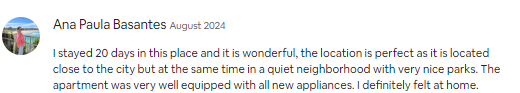 I stayed 20 days in this place and it is wonderful, the location is perfect as it is located close to the city but at the same time in a quiet neighborhood with very nice parks. The apartment was very well equipped with all new appliances. I definitely felt at home.
