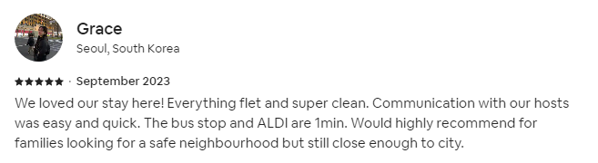 We loved our stay here! Everything flet and super clean. Communication with our hosts was easy and quick. The bus stop and ALDI are 1min. Would highly recommend for families looking for a safe neighbourhood but still close enough to city.
