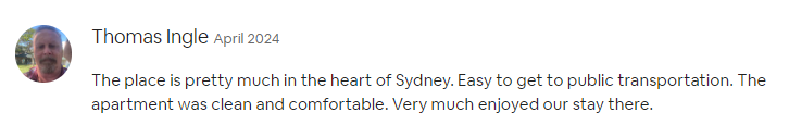 The place is pretty much in the heart of Sydney. Easy to get to public transportation. The apartment was clean and comfortable. Very much enjoyed our stay there.