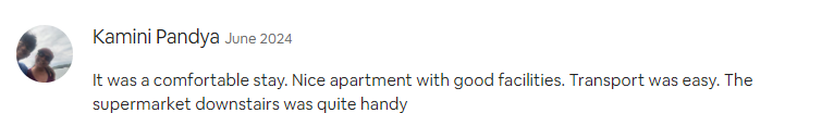 It was a comfortable stay. Nice apartment with good facilities. Transport was easy. The supermarket downstairs was quite handy