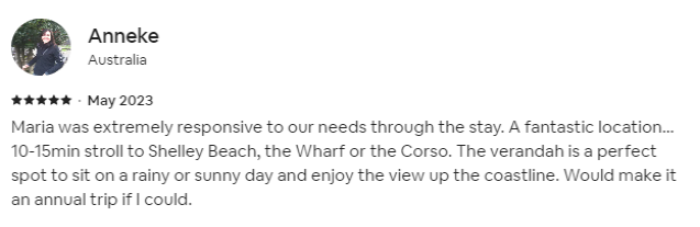 Maria was extremely responsive to our needs through the stay. A fantastic location…10-15min stroll to Shelley Beach, the Wharf or the Corso. The verandah is a perfect spot to sit on a rainy or sunny day and enjoy the view up the coastline. Would make it an annual trip if I could.