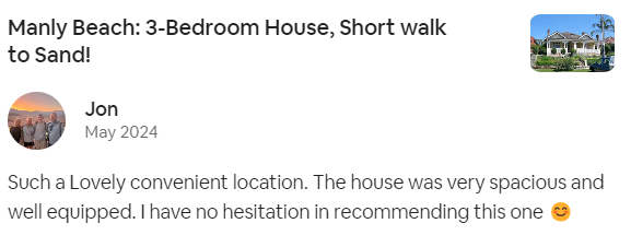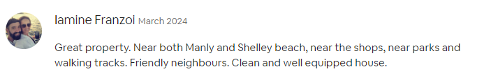 Great property. Near both Manly and Shelley beach, near the shops, near parks and walking tracks. Friendly neighbours. Clean and well equipped house.