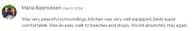 Was very peaceful surroundings, kitchen was very well equipped, beds super comfortable. Was an easy walk to beaches and shops. Would absolutely stay again