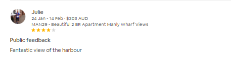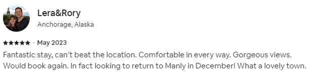 Fantastic stay, can’t beat the location. Comfortable in every way. Gorgeous views. Would book again. In fact looking to return to Manly in December! What a lovely town.