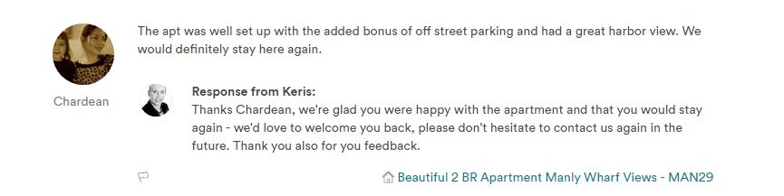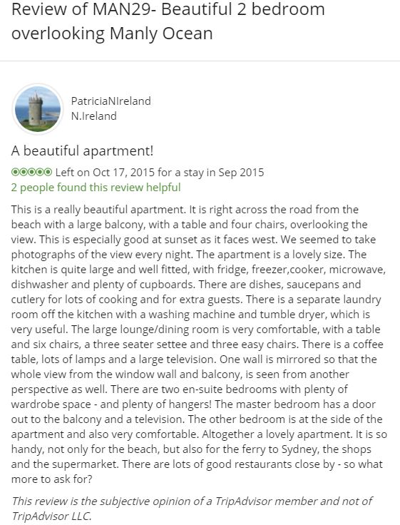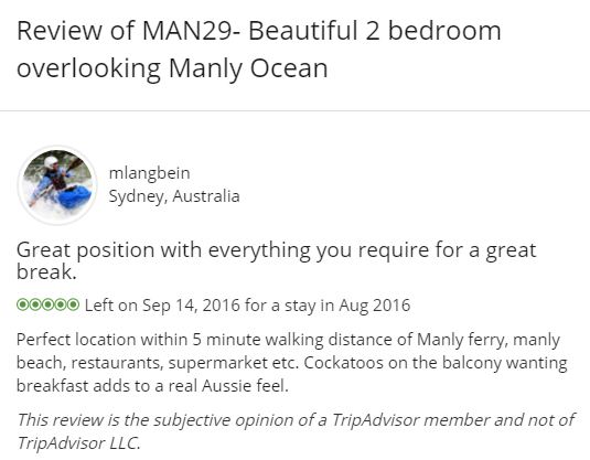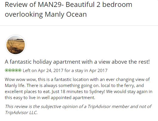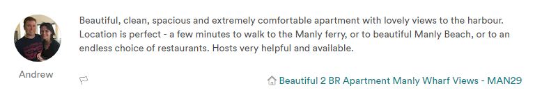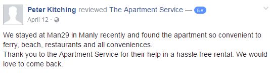 We stayed at Man29 in Manly recently and found the apartment so convenient to ferry, beach, restaurants and all conveniences.