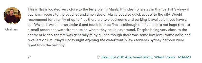 This is flat is located very close to the ferry pier in Manly. It is ideal for a stay in that part of Sydney if you want access to the beaches and amenities of Manly but also quick access to the city. Would recommend for a family of up to 4 as there are two bedrooms and parking is available if you have a car. We had two children under 5 and found it to be fine as although the flat itself is not huge there is a small beach and waterfront outside where they could run around. Despite being very close to the centre of Manly the flat was generally fairly quiet although there was some low-level traffic noise and revellers on Saturday/Sunday night enjoying the waterfront. Views towards Sydney harbour were great from the balcony.