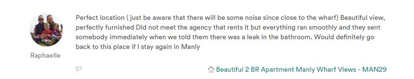 Perfect location ( just be aware that there will be some noise since close to the wharf) Beautiful view, perfectly furnished Did not meet the agency that rents it but everything ran smoothly and they sent somebody immediately when we told them there was a leak in the bathroom. Would definitely go back to this place if I stay again in Manly