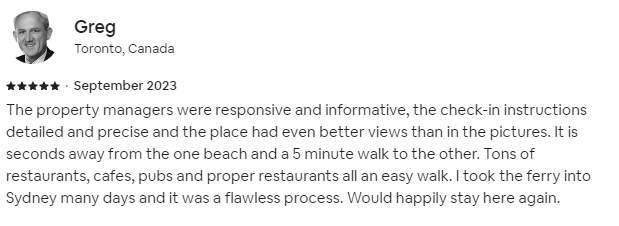 The property managers were responsive and informative, the check-in instructions detailed and precise and the place had even better views than in the pictures. It is seconds away from the one beach and a 5 minute walk to the other. Tons of restaurants, cafes, pubs and proper restaurants all an easy walk. I took the ferry into Sydney many days and it was a flawless process. Would happily stay here again.