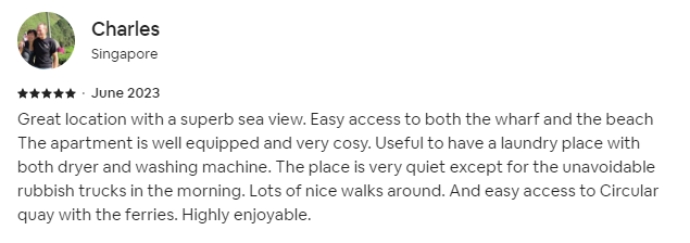 Great location with a superb sea view. Easy access to both the wharf and the beach The apartment is well equipped and very cosy. Useful to have a laundry place with both dryer and washing machine. The place is very quiet except for the unavoidable rubbish trucks in the morning. Lots of nice walks around. And easy access to Circular quay with the ferries. Highly enjoyable.