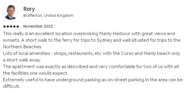 Beautiful, clean, spacious and extremely comfortable apartment with lovely views to the harbour. Location is perfect - a few minutes to walk to the Manly ferry, or to beautiful Manly Beach, or to an endless choice of restaurants. Hosts very helpful and available.