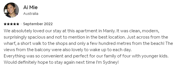 My friend and I loved our stay in Manly. The apartment was very comfortable and stylish and the proximity to the beaches, ferry and shops couldn\'t have suited us more.