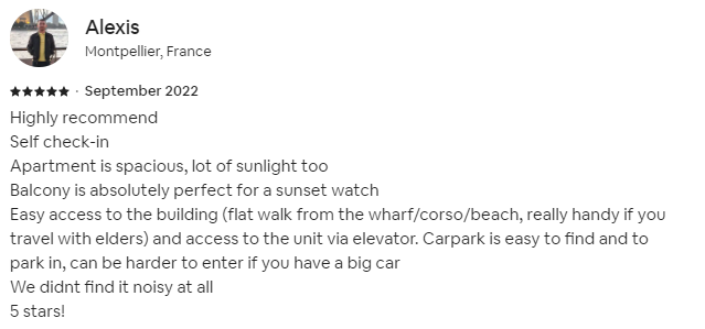 Easy access to the building (flat walk from the wharf/corso/beach, really handy if you travel with elders) and access to the unit via elevator. Carpark is easy to find and to park in, can be harder to enter if you have a big car
