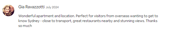 Wonderful apartment and location. Perfect for visitors from overseas wanting to get to know Sydney - close to transport, great restaurants nearby and stunning views. Thanks so much