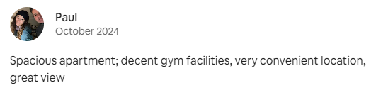 Spacious apartment; decent gym facilities, very convenient location, great view