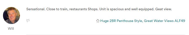 Sensational. Close to train, restaurants Shops. Unit is spacious and well equipped. Geat view.