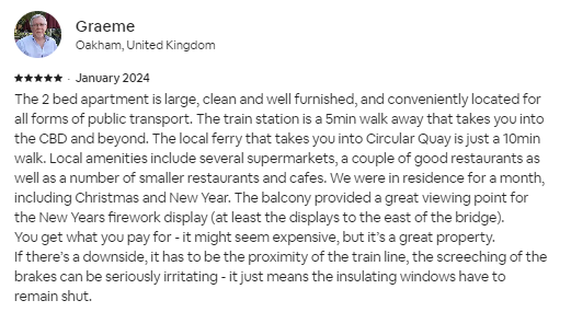 The 2 bed apartment is large, clean and well furnished, and conveniently located for all forms of public transport. The train station is a 5min walk away that takes you into the CBD and beyond. The local ferry that takes you into Circular Quay is just a 10min walk. Local amenities include several supermarkets, a couple of good restaurants as well as a number of smaller restaurants and cafes. We were in residence for a month, including Christmas and New Year. The balcony provided a great viewing point for the New Years firework display (at least the displays to the east of the bridge).