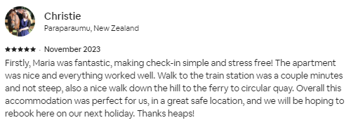 Firstly, Maria was fantastic, making check-in simple and stress free! The apartment was nice and everything worked well. Walk to the train station was a couple minutes and not steep, also a nice walk down the hill to the ferry to circular quay. Overall this accommodation was perfect for us, in a great safe location, and we will be hoping to rebook here on our next holiday. Thanks heaps!