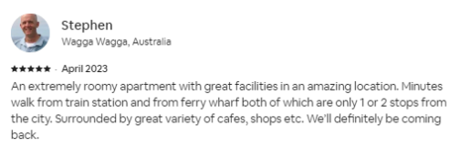 An extremely roomy apartment with great facilities in an amazing location. Minutes walk from train station and from ferry wharf both of which are only 1 or 2 stops from the city. Surrounded by great variety of cafes, shops etc. We’ll definitely be coming back.