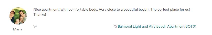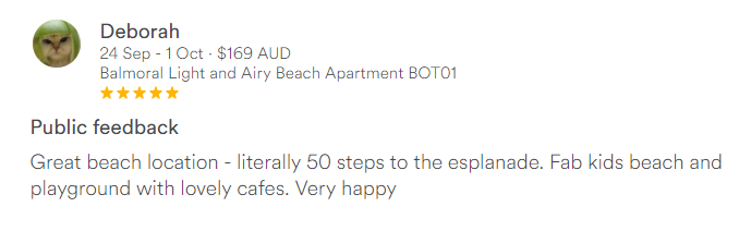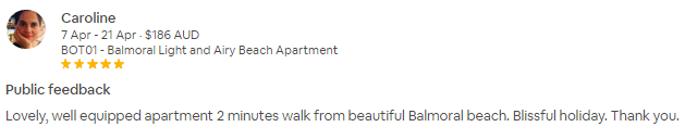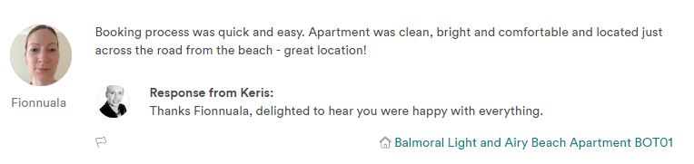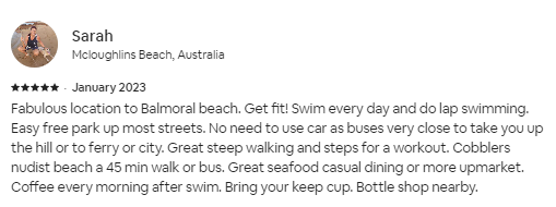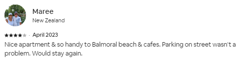 Lovely, well equipped apartment 2 minutes walk from beautiful Balmoral beach. Blissful holiday. Thank you.
