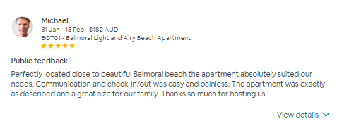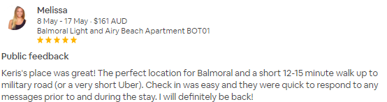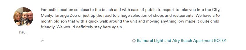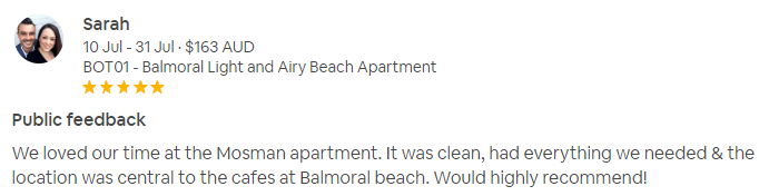 We loved our time at the Mosman apartment. It was clean, had everything we needed & the location was central to the cafes at Balmoral beach. Would highly recommend!