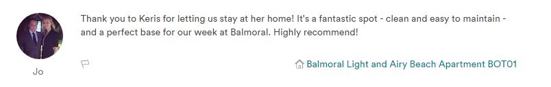 Thank you to Keris for letting us stay at her home! It's a fantastic spot - clean and easy to maintain - and a perfect base for our week at Balmoral. Highly recommend!