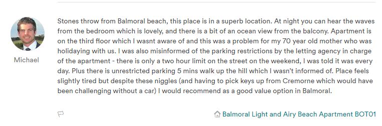 Stones throw from Balmoral beach, this place is in a superb location. At night you can hear the waves from the bedroom which is lovely, and there is a bit of an ocean view from the balcony. Apartment is on the third floor which I wasnt aware of and this was a problem for my 70 year old mother who was holidaying with us. I was also misinformed of the parking restrictions by the letting agency in charge of the apartment - there is only a two hour limit on the street on the weekend, I was told it was every day. Plus there is unrestricted parking 5 mins walk up the hill which I wasn't informed of. Place feels slightly tired but despite these niggles (and having to pick keys up from Cremorne which would have been challenging without a car) I would recommend as a good value option in Balmoral.