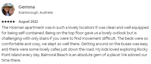 The Mosman apartment was in such a lovely location! It was clean and well equipped for being self-contained. Being on the top floor gave us a lovely outlook but is challenging with only stairs if you were to find movement difficult. The beds were so comfortable and cosy, we slept so well there. Getting around on the buses was easy and there were some lovely cafes just down the road. My kids loved exploring Rocky Point Island every day. Balmoral Beach is an absolute gem of a place! We adored our time there.