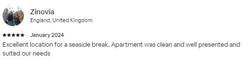 Excellent location for a seaside break. Apartment was clean and well presented and suited our needs