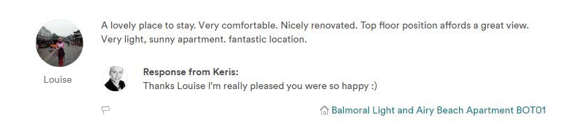 Keris's place was great! The perfect location for Balmoral and a short 12-15 minute walk up to military road (or a very short Uber). Check in was easy and they were quick to respond to any messages prior to and during the stay. I will definitely be back!