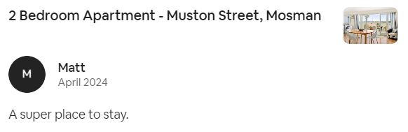 The flat is really well placed in Mosman being only minutes walking to local shops, restaurants and buses. and only a 15 to 20 minute walk (or easy bus) to Balmoral beach. The ferry into Sydney was a joy...20 minute walk (or a bus) to the ferry then a gorgeous ride across Sydney Harbour past the Opera House and Bridge into Central Quay and Sydney itself. The flat itself is slightly old school but is really nice, with open plan sitting/dining/kitchen area leading to a balcony with fantastic view. NOTE : There are quite a few narrow, steep steps to access the flat. We stayed one week at the beginning of our 5 week holiday, then also for the last week...and it felt like coming home Really enjoyed our stays.