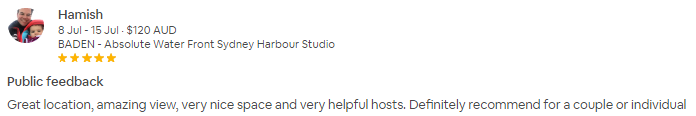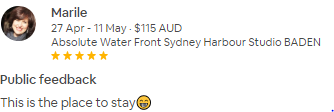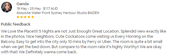 We Love the Place!!!!! 5 Nights are not Just Enough! Great Location. Splendid view exactly like in the photos. Nice Neighbors. Cute Cockatoos come visiting us Every Morning on the Balcony. Easy to get into the city only 10 mins by Ferry or Uber. The room is quite a bit small when we get the bed down. But compare to the room rate it’s highly Worthy!! We are okay with that! We Definitely wanna come back.