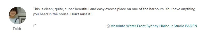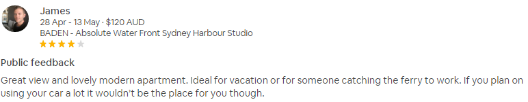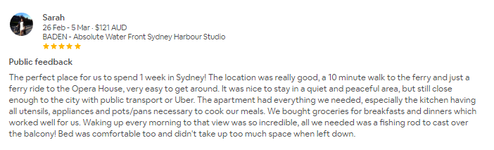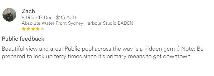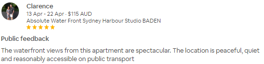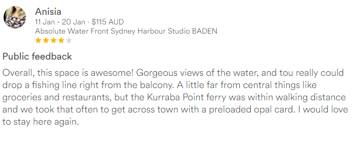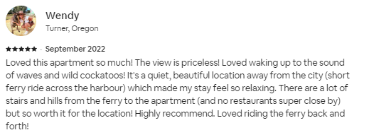 Loved this apartment so much! The view is priceless! Loved waking up to the sound of waves and wild cockatoos! It's a quiet, beautiful location away from the city (short ferry ride across the harbour) which made my stay feel so relaxing. There are a lot of stairs and hills from the ferry to the apartment (and no restaurants super close by) but so worth it for the location! Highly recommend. Loved riding the ferry back and forth!