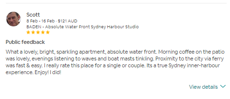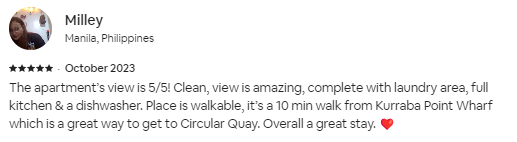The views from the apartment is absolutely stunning and picturesque, making my stay at Shiran\\\'s place very enjoyable. She is a fantastic host, proactively addressing any issues that arose, which I greatly appreciated. The suburb is affluent, and the neigborhood is peaceful. It\\\'s also within walking distance of the public ferry, offering quick access to the Opera House (Circular Quay) in just minutes. If there\\\'s one suggestion I could offer, it would be to upgrade the bed for better sleep quality and adding a proper dining table (there is a coffee table and two chairs at the balcony). With refreshed furnishings, I would happily pay a premium to stay here again!