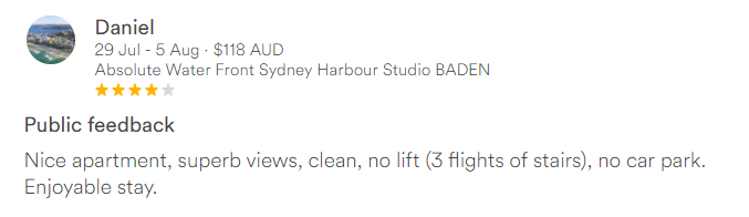 Lovely place, great view. Perfect for a short stay in Sydney.
