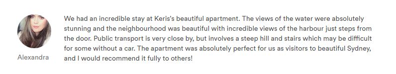 We had an incredible stay at Keris's beautiful apartment. The views of the water were absolutely stunning and the neighbourhood was beautiful with incredible views of the harbour just steps from the door. Public transport is very close by, but involves a steep hill and stairs which may be difficult for some without a car. The apartment was absolutely perfect for us as visitors to beautiful Sydney, and I would recommend it fully to others!