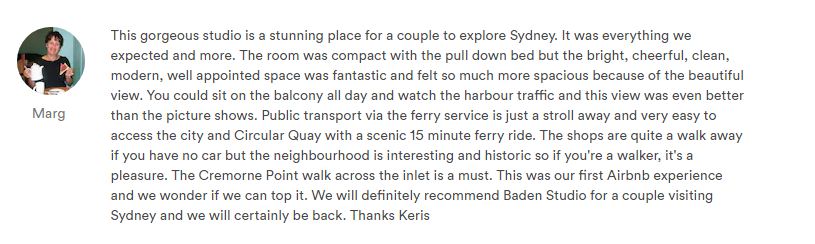 This gorgeous studio is a stunning place for a couple to explore Sydney. It was everything we expected and more. The room was compact with the pull down bed but the bright, cheerful, clean, modern, well appointed space was fantastic and felt so much more spacious because of the beautiful view. You could sit on the balcony all day and watch the harbour traffic and this view was even better than the picture shows. Public transport via the ferry service is just a stroll away and very easy to access the city and Circular Quay with a scenic 15 minute ferry ride. The shops are quite a walk away if you have no car but the neighbourhood is interesting and historic so if you're a walker, it's a pleasure. The Cremorne Point walk across the inlet is a must. This was our first Airbnb experience and we wonder if we can top it. We will definitely recommend Baden Studio for a couple visiting Sydney and we will certainly be back. Thanks Keris